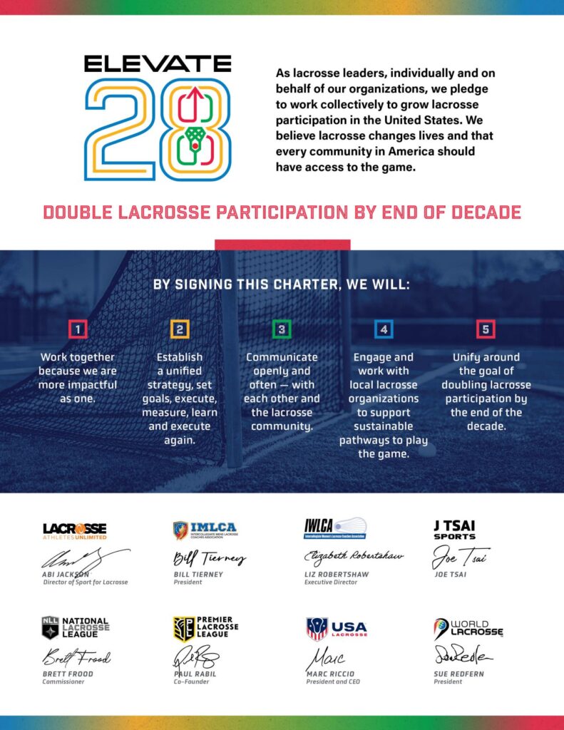 On October 31st, 2023, eight of the world’s leading lacrosse organizations came together in unprecedented unity to sign the ELEVATE28 Charter. This monumental document states that the National Lacrosse League, Athletes Unlimited, Intercollegiate Men’s Lacrosse Coaches Association, Intercollegiate Women’s Lacrosse Coaches Association, Joe Tsai Sports, Premier Lacrosse League, USA Lacrosse, and World Lacrosse combined efforts and resources to double lacrosse participation in the United States by 2030.